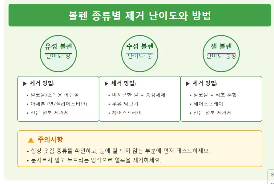 일반적으로 우리가 자주 사용하는 볼펜은 유성 볼펜, 수성 볼펜, 젤 볼펜으로 나눌 수 있어요. 특히 유성 볼펜은 기름 성분이 포함되어 있어서 제거하기가 까다로운 편이에요. 반면에 수성 볼펜은 물에 잘 녹는 성질 때문에 비교적 쉽게 지울 수 있죠.