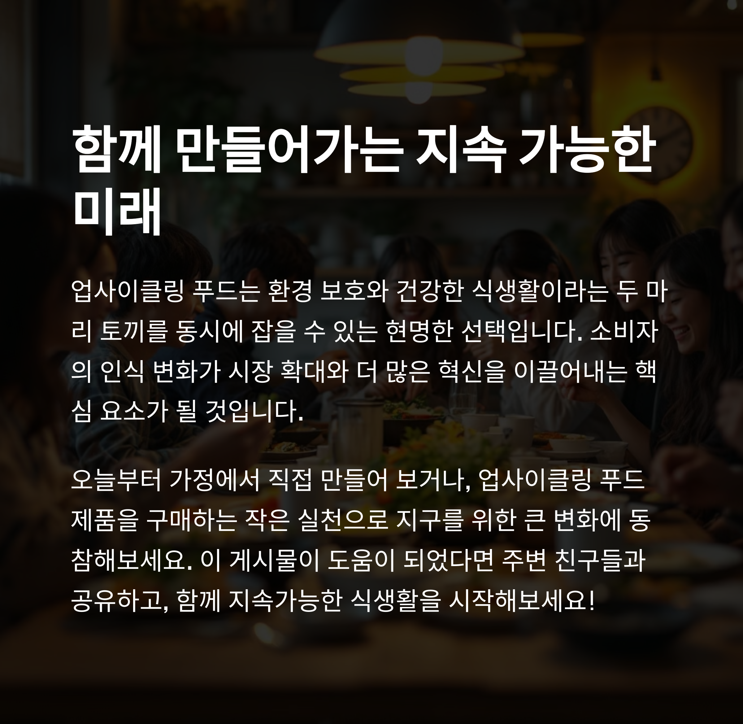 업사이클링 푸드는 단순한 식품 트렌드를 넘어, 음식물 쓰레기 문제 해결, 자원 효율성 증대, 온실가스 배출량 감소에 기여하는 지속 가능한 미래를 위한 필수적인 해결책입니다. 식품 생산 과정에서 버려지던 부산물과 상품성이 떨어지는 농산물에 새로운 가치를 부여함으로써, 우리는 환경 보호와 식량 안보를 동시에 달성할 수 있어요.