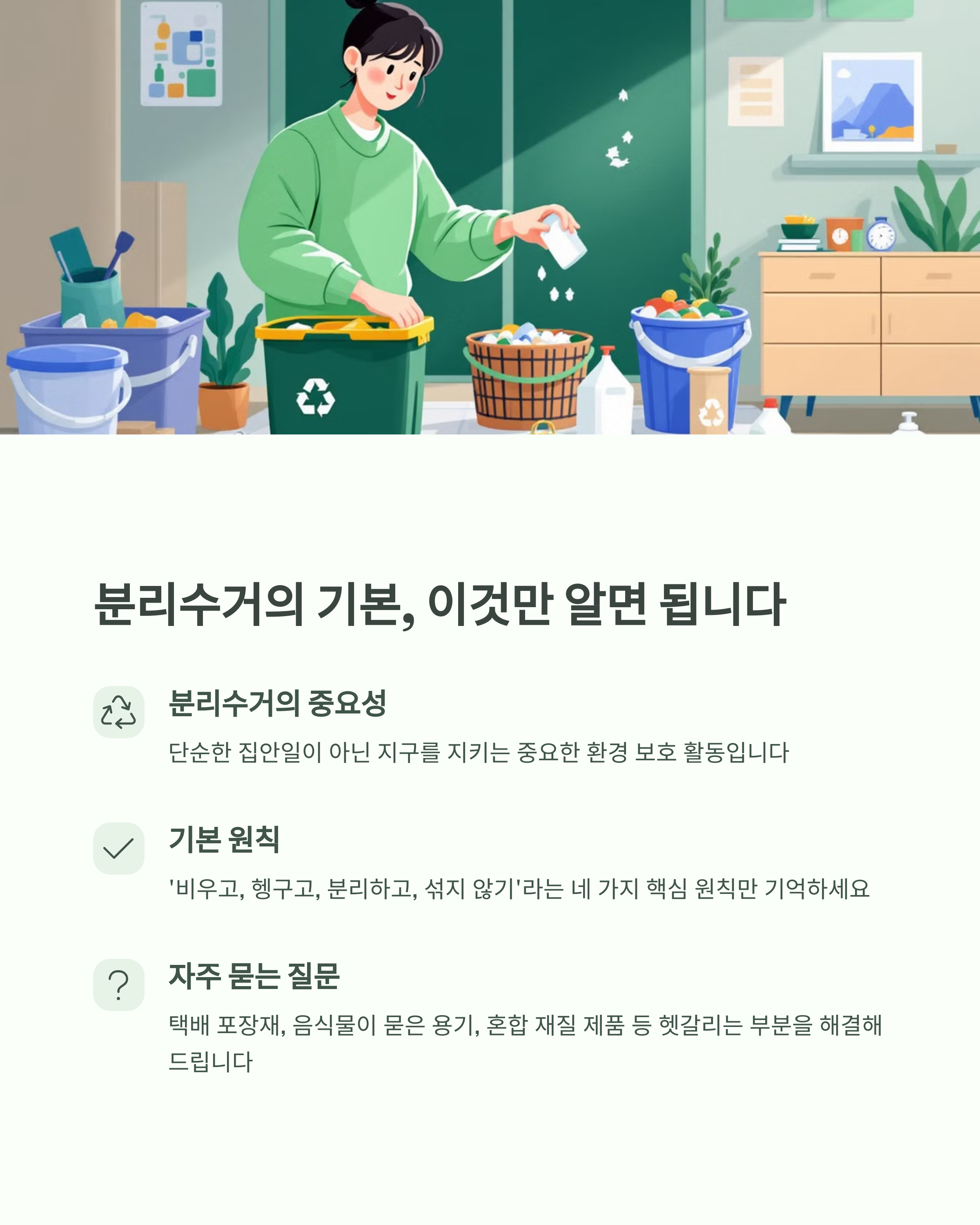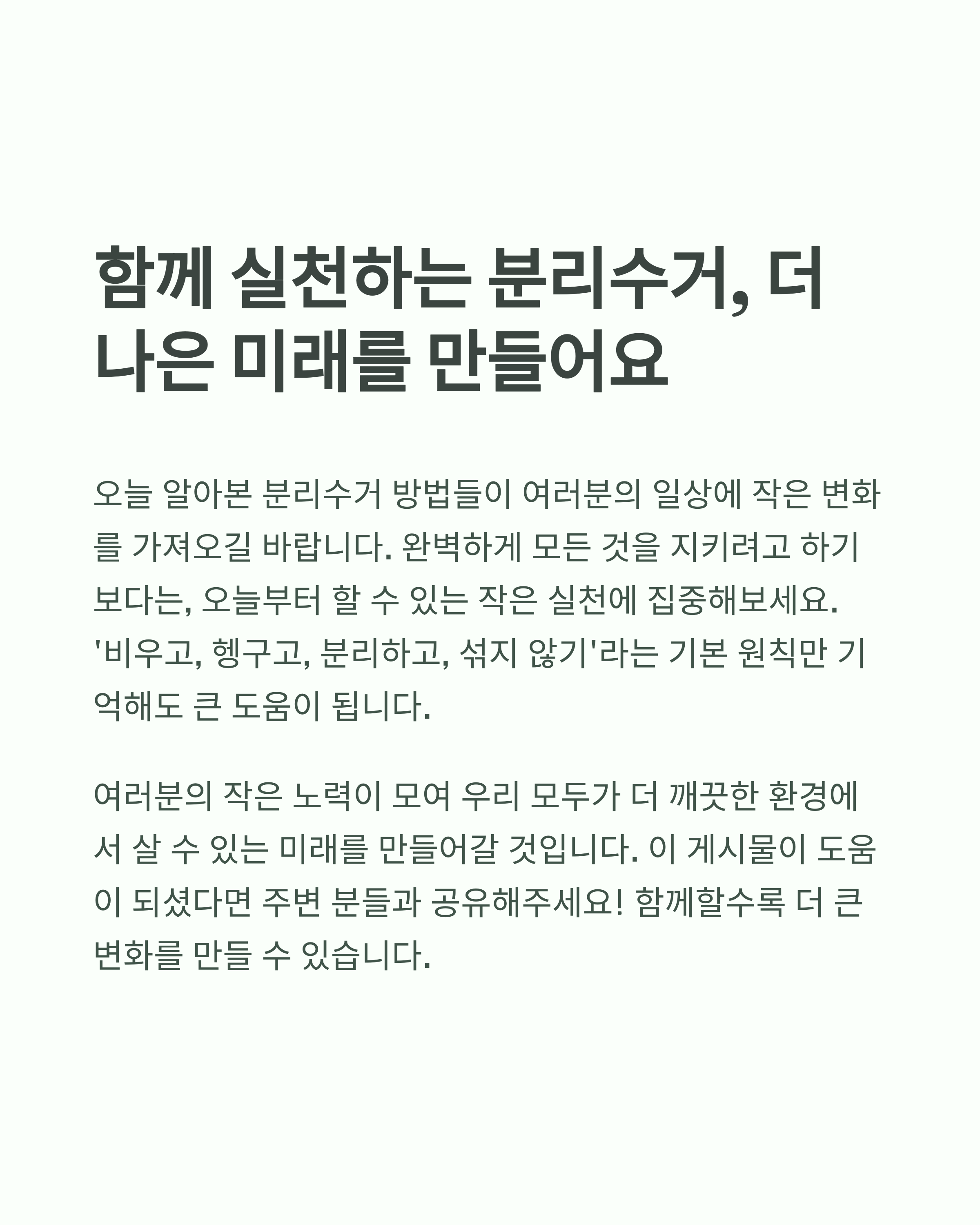 "비우고, 헹구고, 분리하고, 섞지 않기" - 이 네 가지 기본 원칙을 지키는 것만으로도 여러분의 분리수거 품질은 크게 향상됩니다.