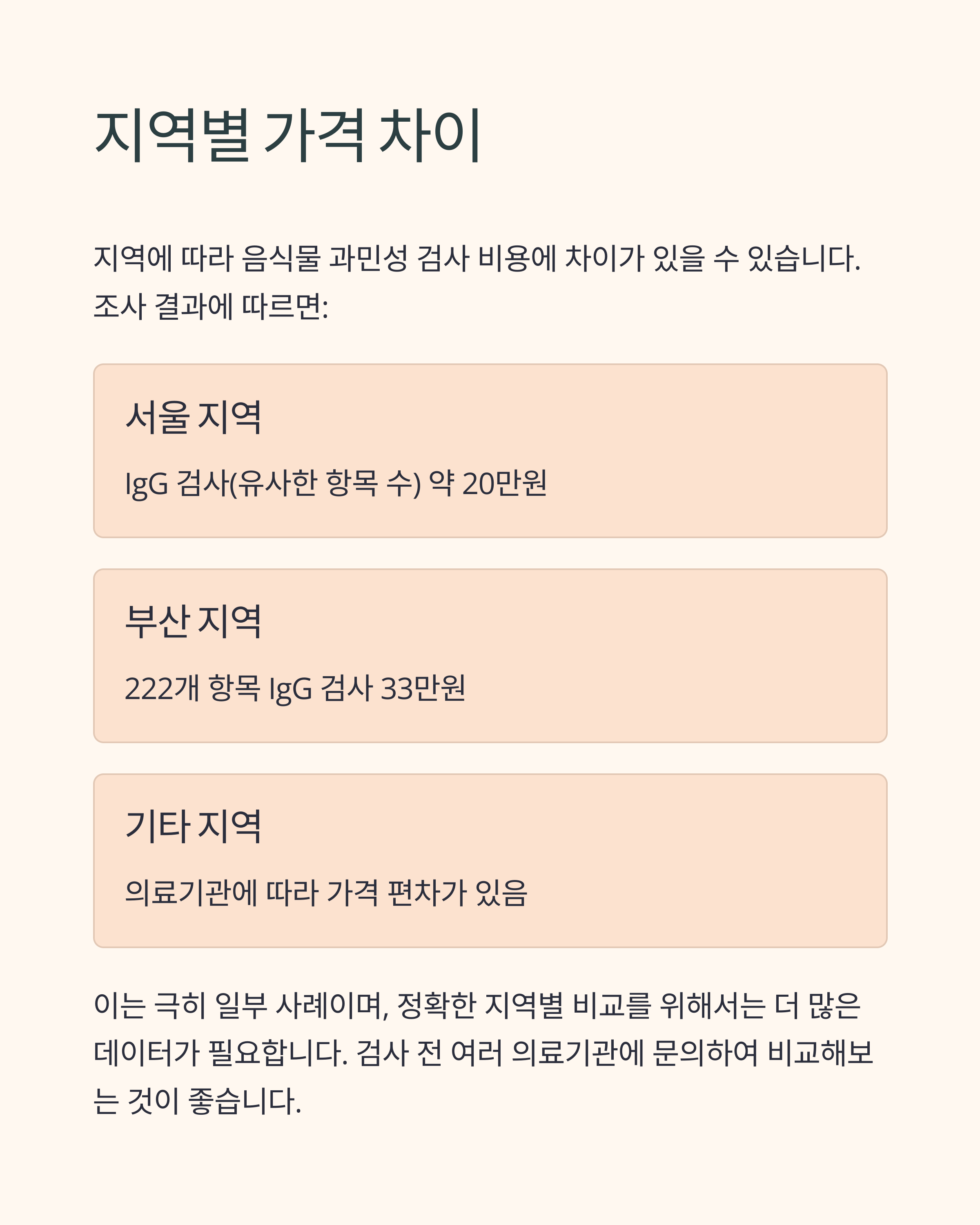 제가 조사한 바로는 지역에 따라 비용 차이가 있을 수 있어요. 예를 들어, 부산 지역의 한 의료기관에서는 222개 항목 IgG 검사가 33만원인 반면, 서울 지역의 한 의원에서는 유사한 IgG 검사가 약 20만원으로 제시되었어요. 물론 이건 극히 일부 사례이고, 정확한 지역별 비교를 위해서는 더 많은 데이터가 필요해요.