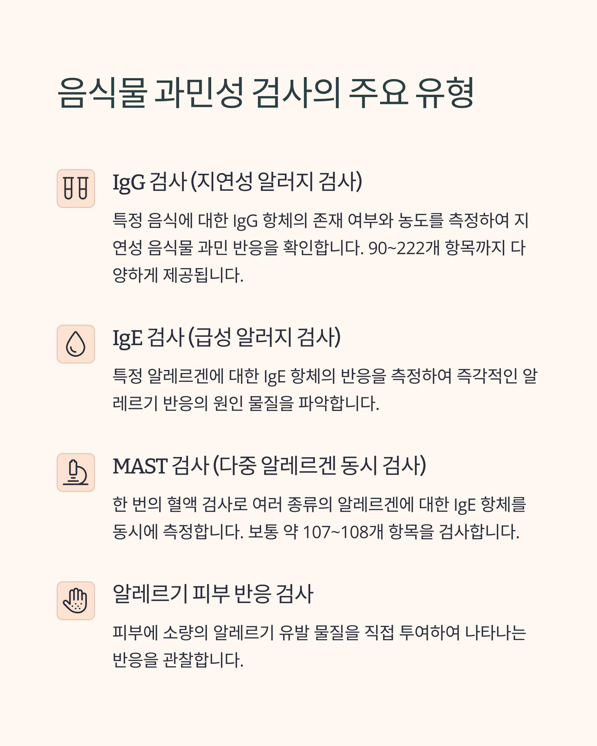 - MAST 검사 (다중 알레르겐 동시 검사): 한 번의 혈액 검사로 여러 종류의 알레르겐(음식, 흡입성 항원 등)에 대한 IgE 항체를 동시에 측정하는 방법입니다. 보통 약 107~108개 항목을 검사합니다.