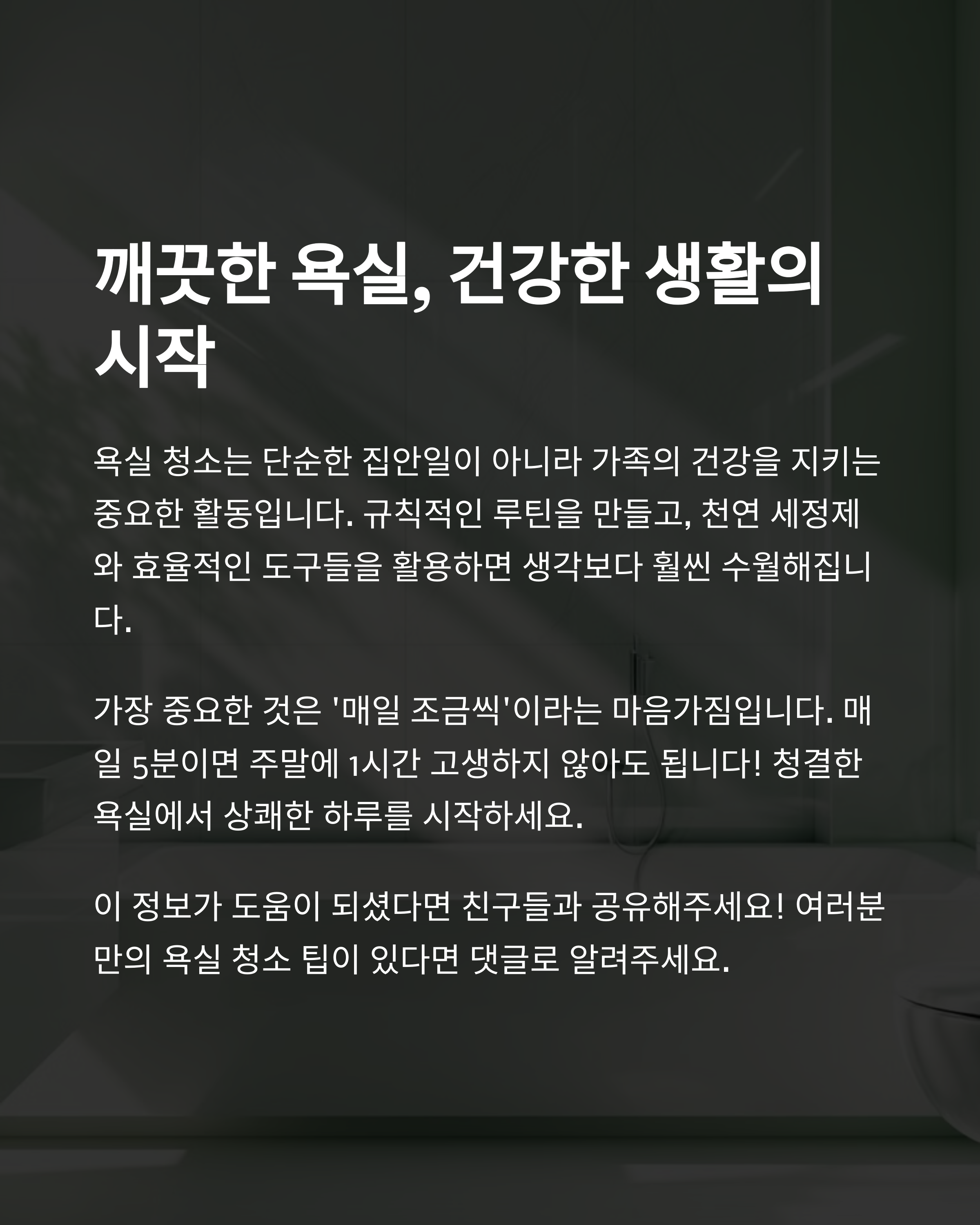 태그: 욕실청소, 건강관리, 천연세정제, 곰팡이제거, 물때제거, 친환경청소, 청소팁, 가정관리, 웰빙, 생활꿀팁