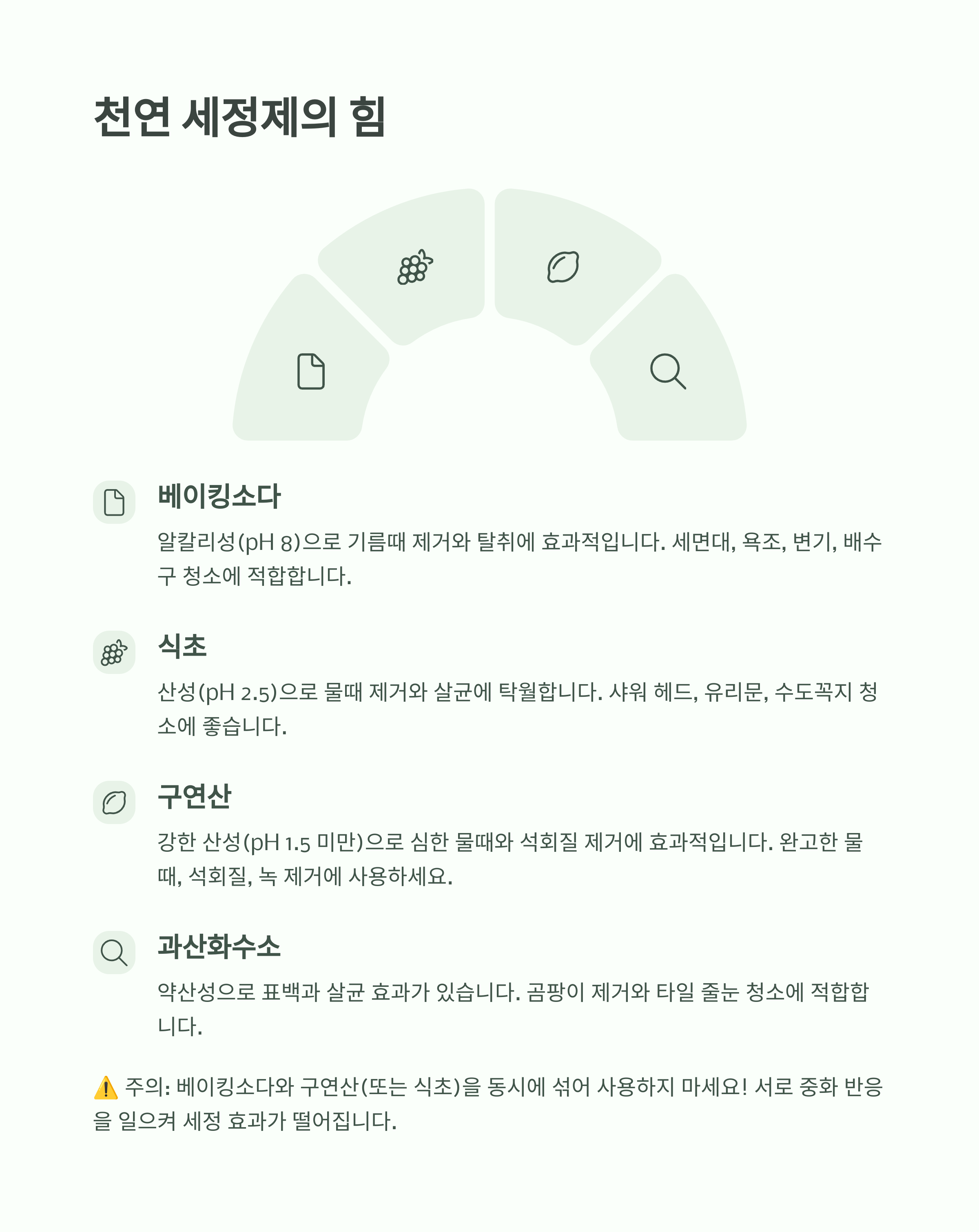 | 베이킹소다 | 알칼리성 (pH 8) | 기름때 제거, 탈취 | 세면대, 욕조, 변기, 배수구 |