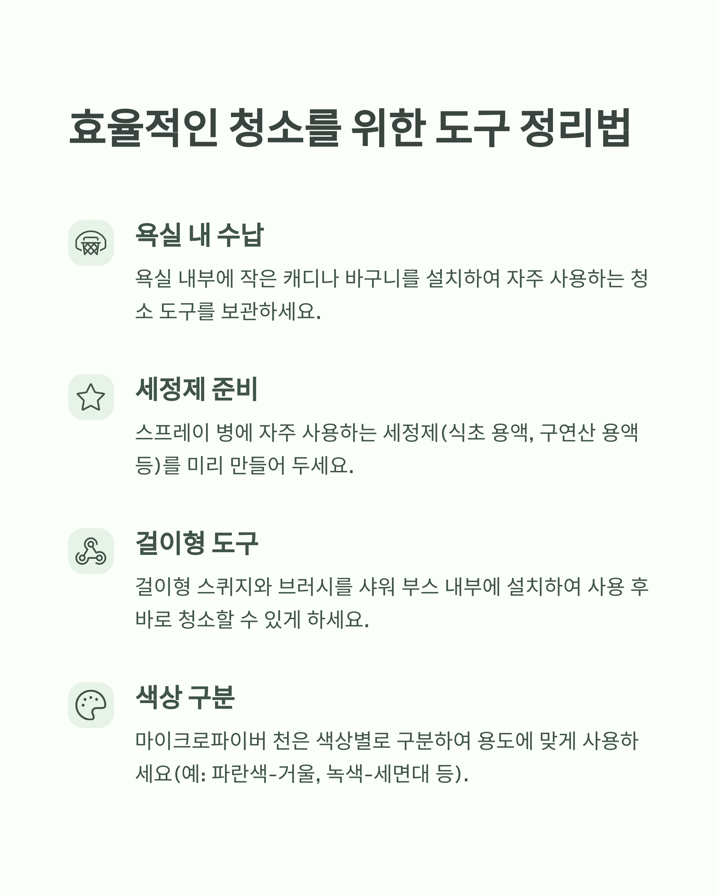 "매일 1분의 관리가 주말 1시간의 고생을 줄여줍니다. 욕실을 사용한 후 잠깐의 시간을 투자하는 습관이 청소의 부담을 크게 줄여줘요."