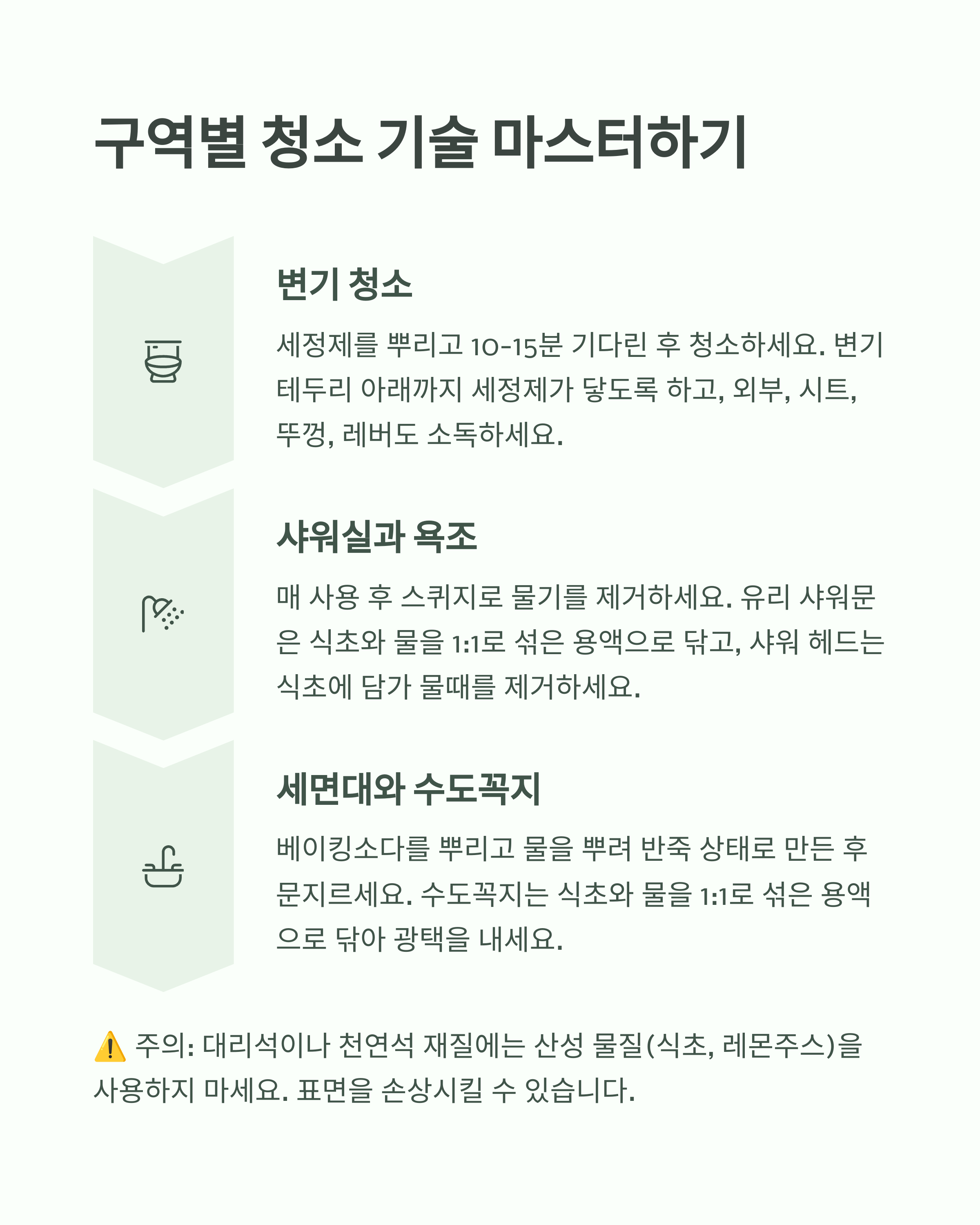 욕실 청소가 어렵게 느껴지는 이유 중 하나는 각 구역마다 다른 접근 방법이 필요하기 때문이에요. 변기, 샤워부스, 세면대, 타일 등 각 부분에 맞는 청소 방법을 알면 훨씬 효과적으로 청소할 수 있습니다.